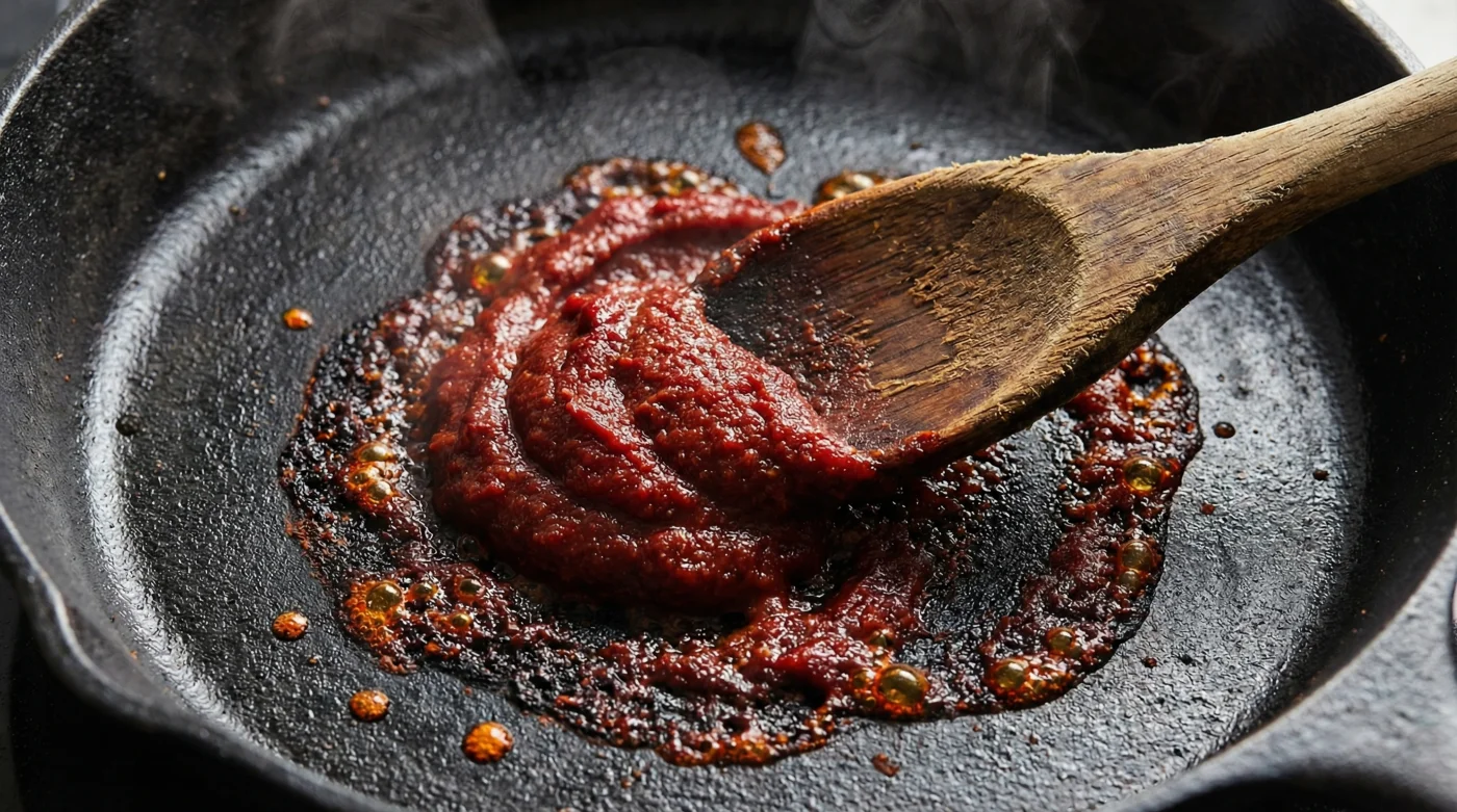 Gib nun das Tomatenmark direkt in das heiße Fett am Pfannenboden. Dies ist der Moment, in dem die physische Arbeit beginnt. Rühre das Mark mit einem Holzlöffel kontinuierlich um. Du wirst sehen, wie es anfängt, sich am rauen Pfannenboden leicht anzulegen – das ist absolut erwünscht und bildet die Basis der Röstaromen. Achte auf das Geräusch: Es sollte sanft rösten, nicht aggressiv knistern oder spritzen.