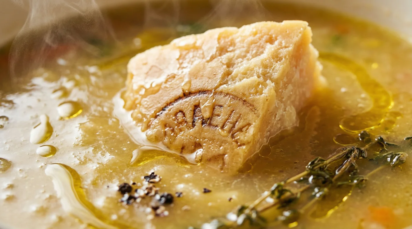 Wenn du diese Kante nicht entsorgst, sondern in eine leise blubbernde Brühe wirfst, beginnt ein langsamer, natürlicher Prozess. Die sanfte Hitze weicht die verhärteten Fasern auf und zieht tiefes, erdiges Umami direkt in deine Suppe. Es kostet dich keinen Cent extra und erfordert absolut keine Mühe. Du fügst dem Topf eine Dimension hinzu, die sonst verborgen bliebe.