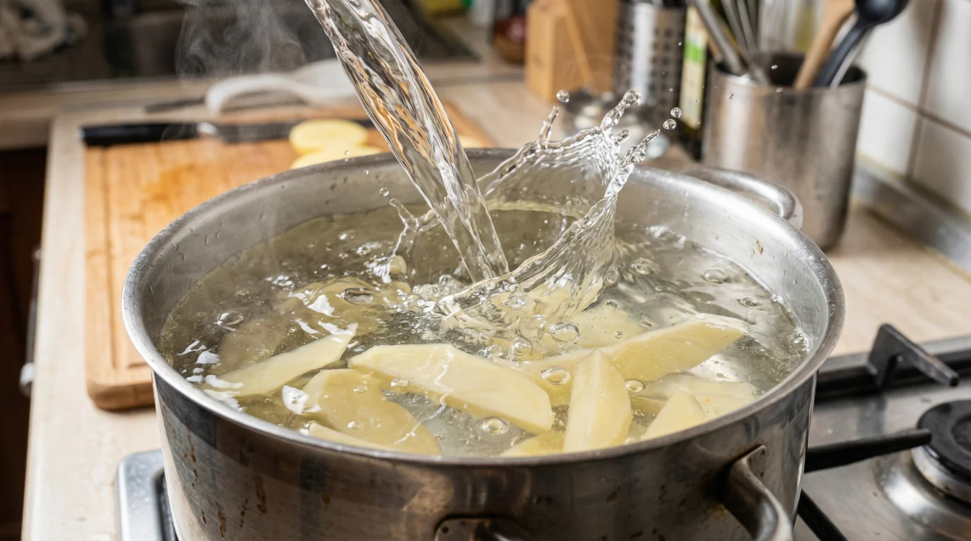 Achte darauf, den Essig erst hinzuzufügen, wenn das Wasser bereits kocht. So verteilt er sich sofort gleichmäßig, und die Säure umschließt die Kartoffeln von der ersten Sekunde an. Sobald die Kartoffeln die gewünschte Garstufe erreicht haben, ist das sofortige Ausdampfen der wichtigste Schritt vor dem Braten.