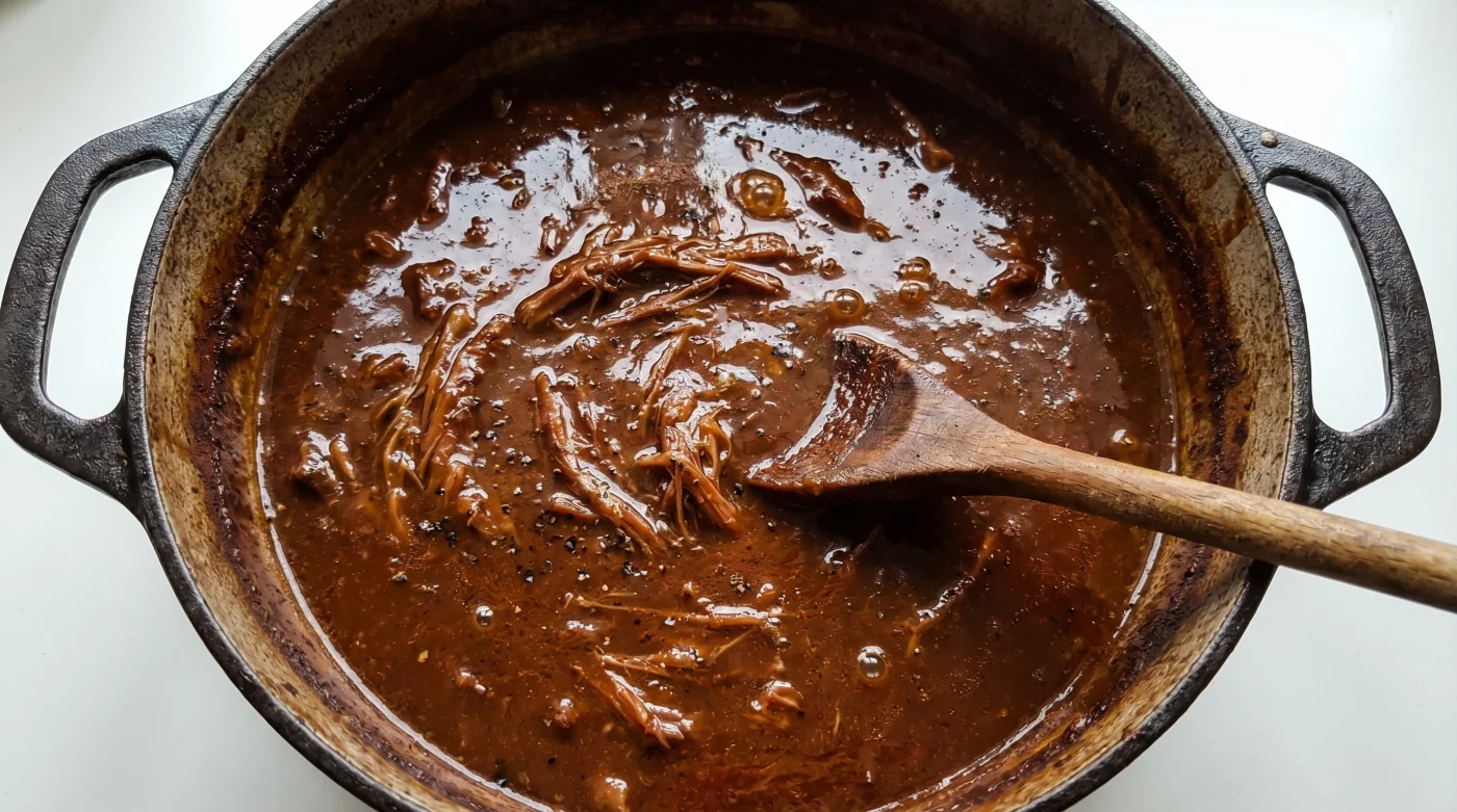 - Die Ruhephase: Geben Sie das Fleisch zurück in den Topf. Füllen Sie den Rest auf, decken Sie den Topf ab und lassen Sie alles bei konstant 90 Grad Celsius für mindestens drei Stunden im Ofen schmoren.